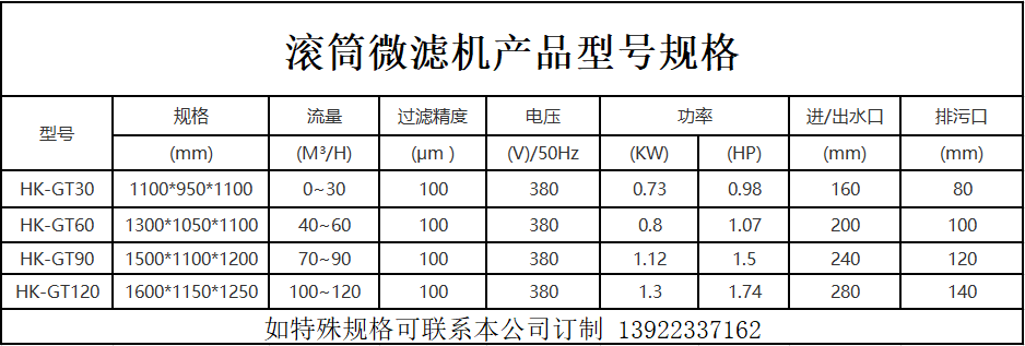 有动力滚筒微滤机是利用一个可以转动的滚筒来进行过滤的,在微滤机箱体的外部,有一台抽水泵,有一台电机驱动,还有一个电箱。电机驱动是用于带动滚筒工作,抽水泵是用于抽走经过过滤干净的水。滚筒在电机的作用下转动,同时,位于滚筒上方的一排喷嘴把高压水雾冲向筛网,附着于筛网内部的污物被冲到滚筒内部的一个集污槽中,再经过排污管流出,从而达到分离水体中固体颗粒的目的。