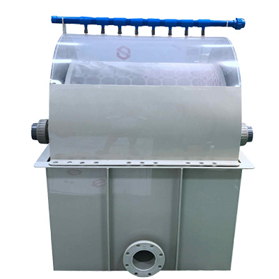 广州环控的滚筒微滤机是一种转鼓式筛网过滤装置,采用的是80-200目/平方英寸的微孔筛网固定在转鼓型过滤设备上,通过截留养殖水体中的固体颗粒,实现固液分离的净化装置。当滚筒微滤机的滚筒内悬浮物积聚到一定数量时,会引起滤网透水量下降,导致滚筒内水位上升,当水位上升到设定的高水位时,液位自动控制系统工作,此时,反清洗水泵和滚筒电机同时自动开启,反清洗水泵的高压水经微滤机的反清洗系统对旋转的滚筒滤网进行高压清洗,堵塞在滚筒滤网上的悬浮物在高压水的冲洗下,流入污物收集槽再经排污管排出。当滤网清洗干净后,滚筒滤网的透水量上升,滚筒内的水位下降,当水位降至设定的低水位时,反清洗水泵和滚筒电机将自动停止工作,微滤机又进入新一轮工作循环。